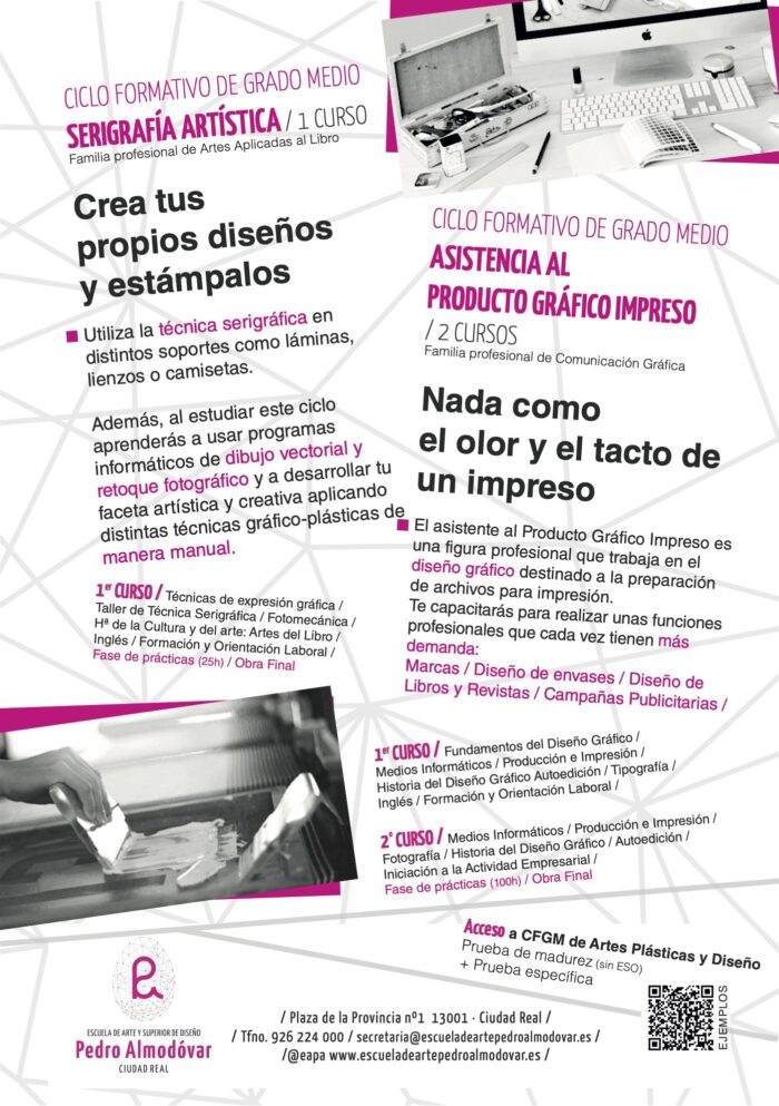 El ciclo de Serigrafía Artística impartido en la Escuela de Arte y Superior de Diseño Pedro Almodóvar es una enseñanza profesional pública y gratuita con acreditación oficial en todo el territorio español.